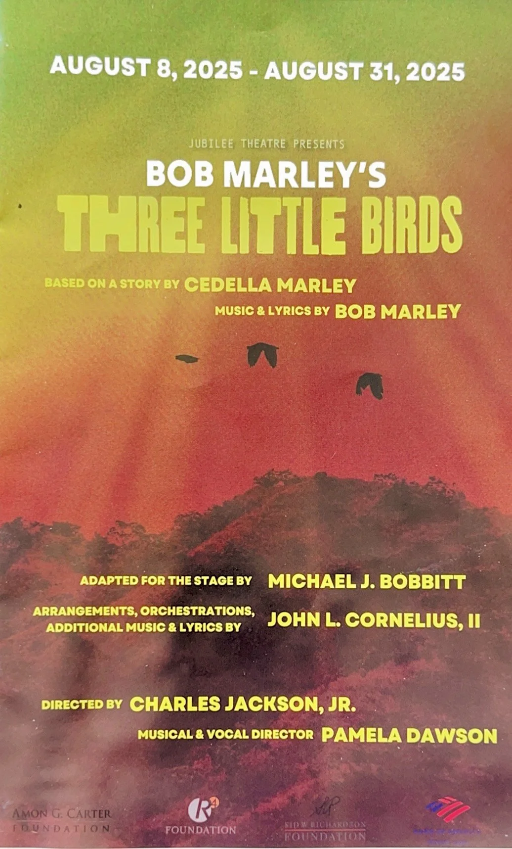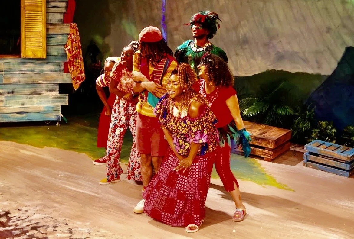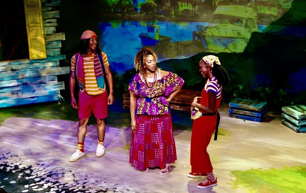 The vibrant colors of Jamaica surround you in this charming musical folk tale and coming of age story with music and lyrics by Bob Marley. Three Little Birds, written by Cedella Marley and adapted for the stage by Michael J. Bobbitt, weaves its fun and magical story before a vivid mural of a Jamaican landscape designed by Gabrielle Malbrough. The colors continue on to Malbrough’s set pieces and Hope Cox’s terrific, especially for the birds, costumes. The lighting from Jonah Gutierrez and projections from Holli Price add much to the tropical vibe and Ryan Simon’s sound design keeps those familiar Bob Marley tunes as clear and sweet as an ocean breeze.