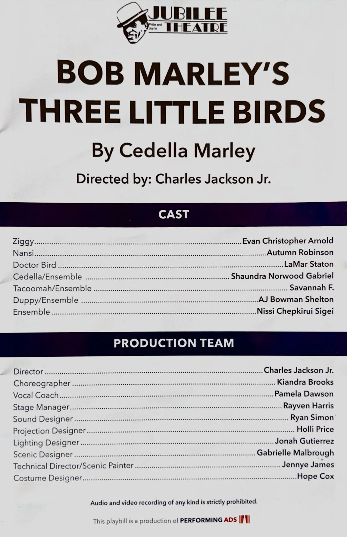 Director Charles Jackson Jr. directs with an eye toward entertaining the youngsters and there is nary a slow moment in the show. Choreographer Kiandra Brooks’ spirited dances evoke the tropics and Vocal Coach Pamela Dawson has the cast in top vocal form singing Marley’s well-known songs like “One Love” and “So Much Trouble in the World.” And everyone has authentic sounding Jamaican accents.