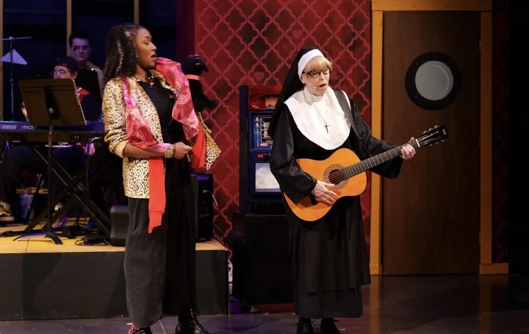 It’s always fun to hear all those 70’s pop tunes and most especially here where the terrific onstage band led by Music Director Joey O’Reilly keeps the audience rocking and swaying for two hours. O’Reilly actually becomes part of the show and interacts with characters and can he ever work the keyboards and the saxophone. O’Reilly and the band are really “hot stuff” and Choreographer Amy Cave keeps the characters grooving to their beat with disco flavored retro moves.