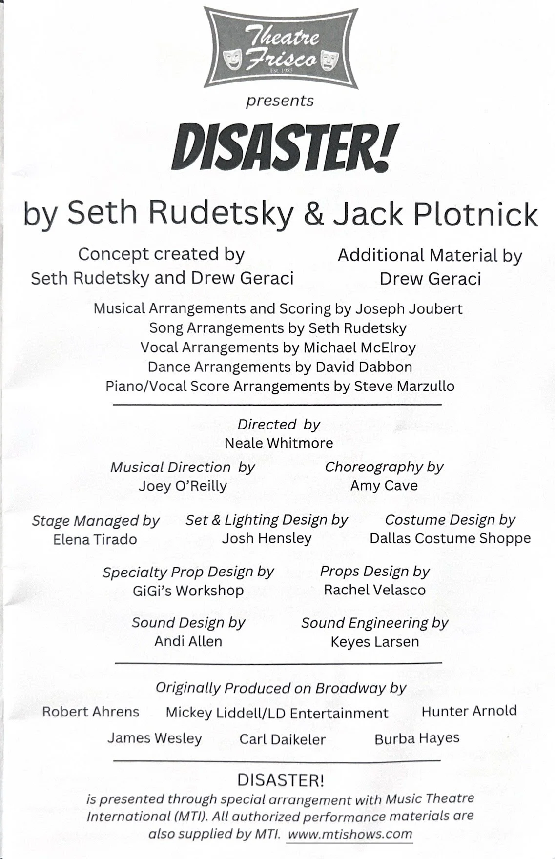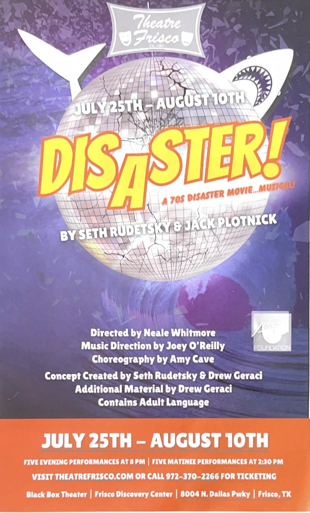 Even If you have seen Disaster! as many times as I have, you are going to have great fun at Theatre Frisco’s production. There’s so much I couldn’t reveal here, but, trust me, you will want to go down with this ship.