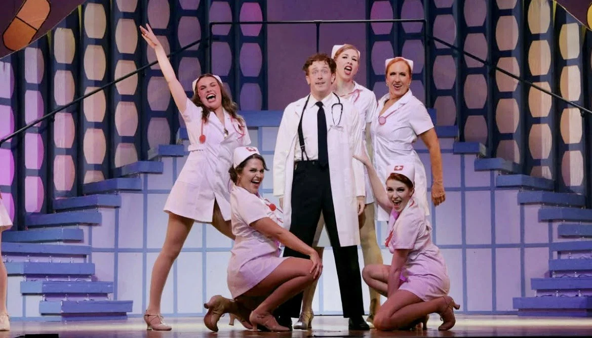 Michael A. Robinson/Dallas Costume Shoppe serves as the costumer and has the huge cast, especially the female members, looking sharp and period appropriate. There are stewardess costumes and nurse costumes and some gorgeous dresses adorned with musical notes for the ladies who “sing along with Mitch.” There’s even a mink coat which covers the bathing suit of “bunny” and high-priced prostitute Cheryl Ann played with sexy sass by Caren Sharpe. It is quite dazzling to see this beautifully clad ensemble (which includes 22 multi-talented actors if I counted correctly) performing Choreographer Kelly McCain’s intricate and inventive choreography which often caused the audience to break into applause.