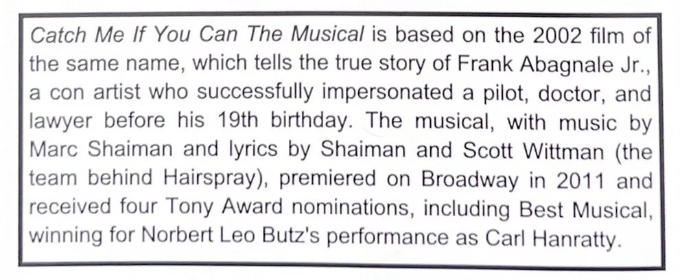 I was not a big fan of Catch Me If You Can initially. I actually fell asleep watching it on Broadway where it had a less than successful run. I enjoyed the score by Marc Shaiman and Scott Wittman, but Terrence McNally’s book tried to cover far too much, and the momentum of the show lagged.