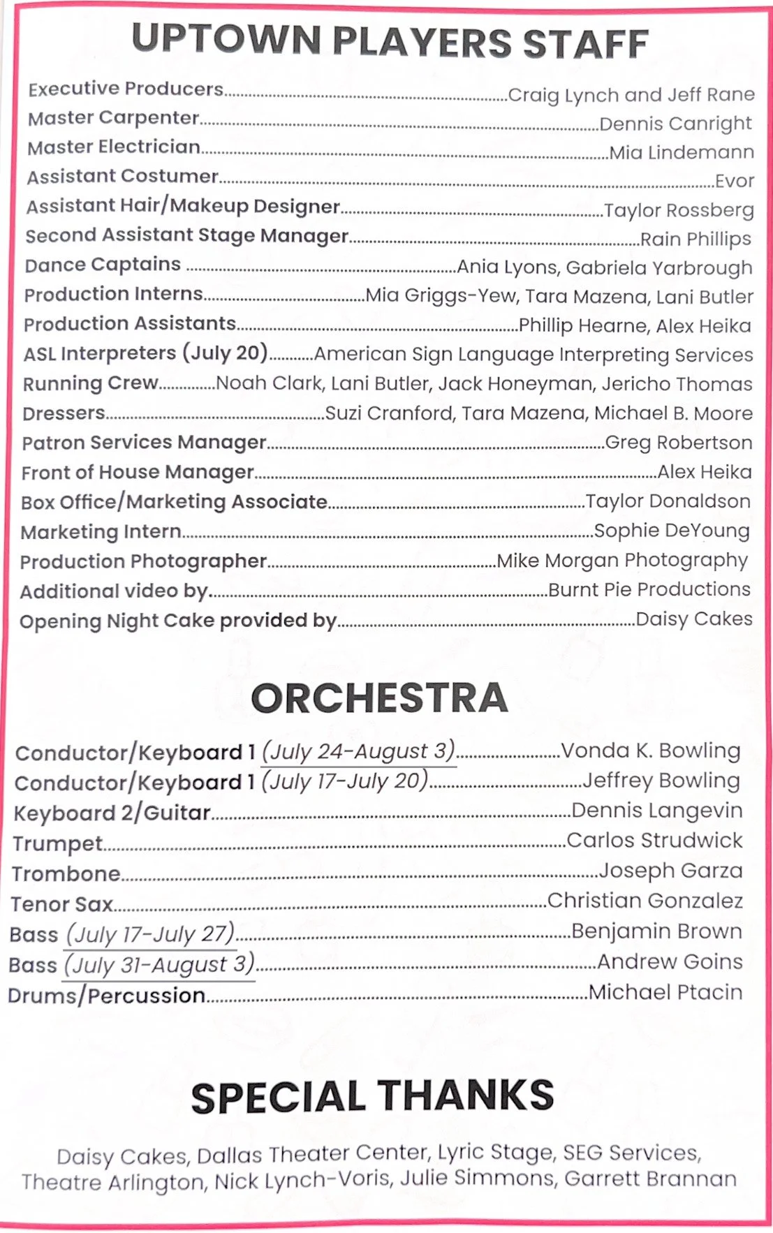Incomparable Music Director Vonda K. Bowling leads the orchestra, plays Keyboard 1, and has all the Jamie vocalists delivering their best. The excellent orchestra includes Dennis Langevin, Carlos Strudwick, Joseph Garza, Christian Gonzalez, Benjamin Brown, Andrew Goins, and Michael Ptacin. Shout out to Jeffrey Bowling who conducted and played keyboard for performances from July 17-20.