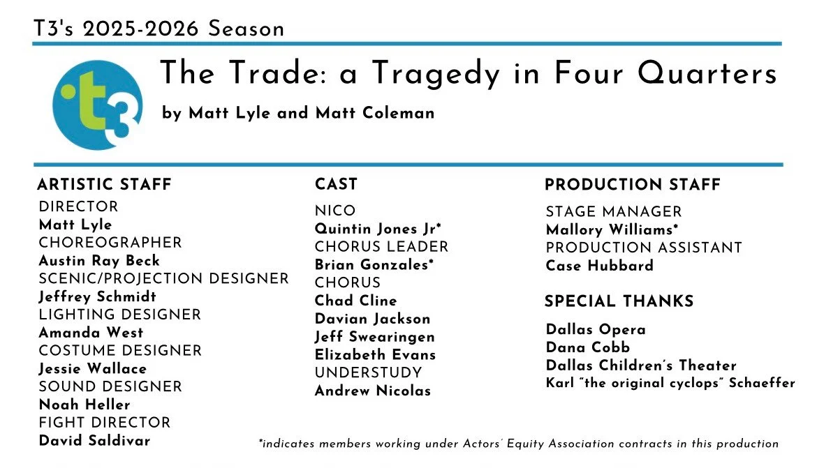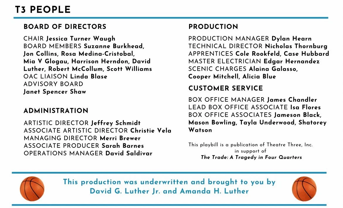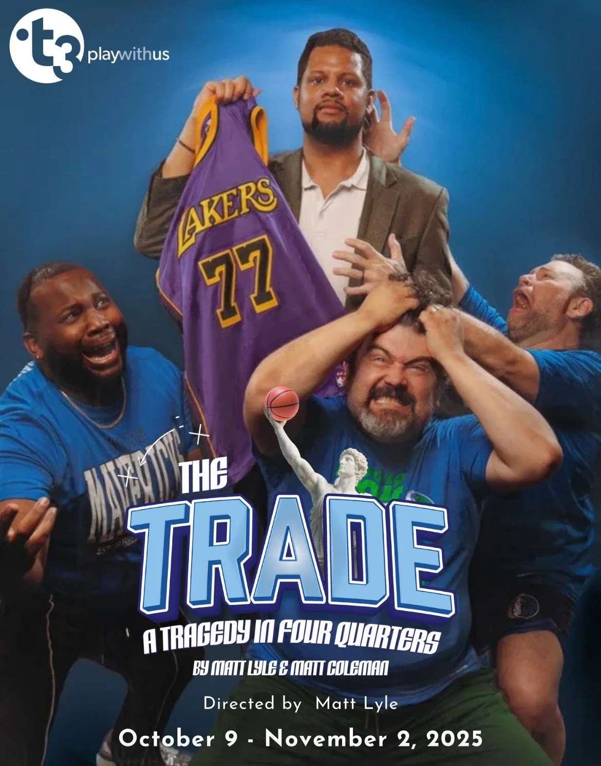 I was hesitant about attending The Trade: A Tragedy in Four Quarters by Matt Lyle and Matt Coleman, considering my knowledge of professional sports could fit in a thimble. However, within minutes after this hybrid of a Greek tragedy and a howlingly funny comedy began, I was caught up in the spirit of the evening as Theatre Three became a stadium filled with Dallas Mavericks fans.