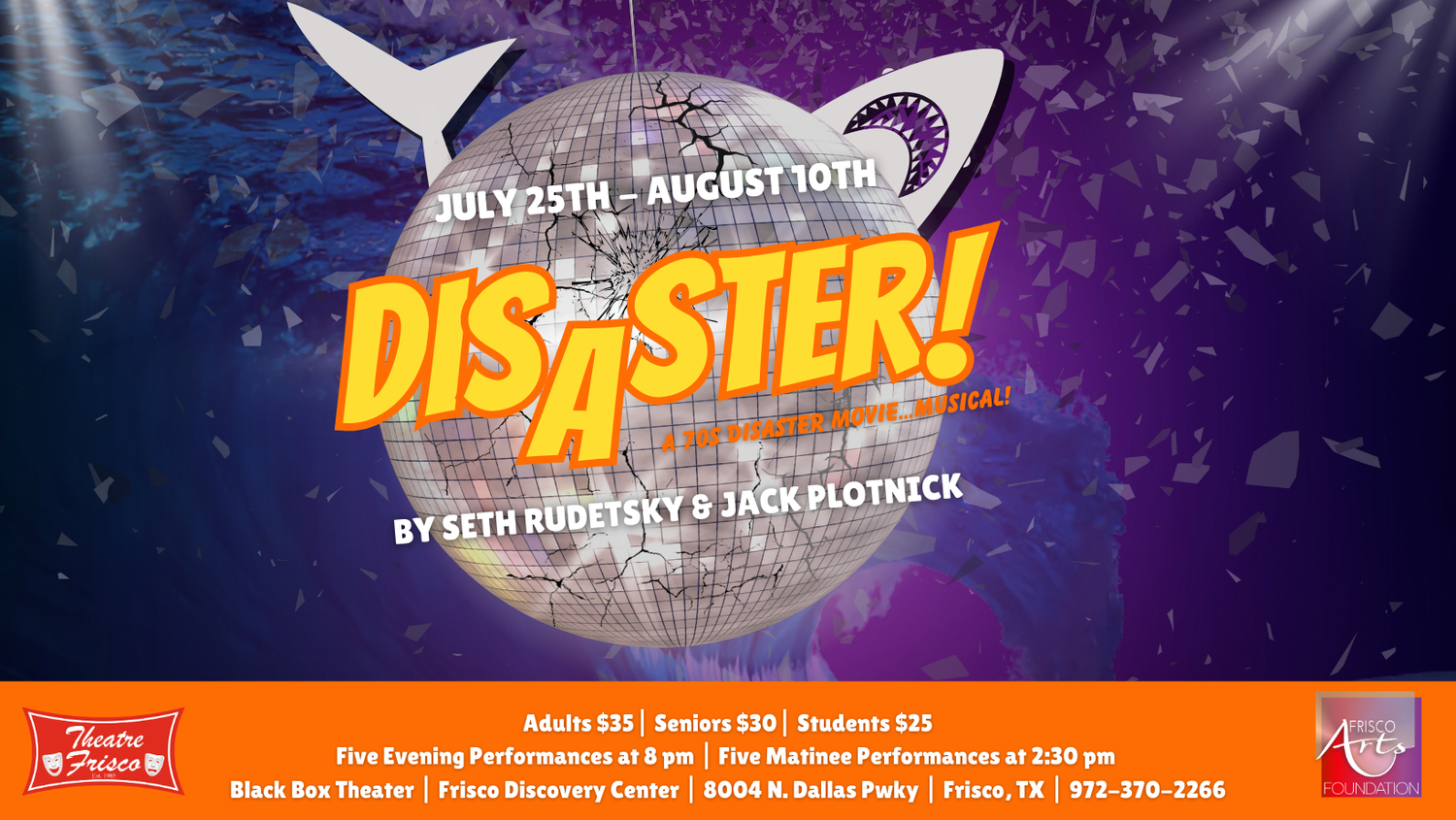 A group of New Yorkers attend the opening of a floating casino-discothèque that quickly succumbs to multiple calamities, hilariously reprising 1970s disaster films from sinking ships to earthquakes to piranhas. Following the 70s theme, the musical numbers feature hit songs from the decade. Hum along to familiar tunes as these hapless characters careen from one catastrophe to another. Will everyone make it out alive?